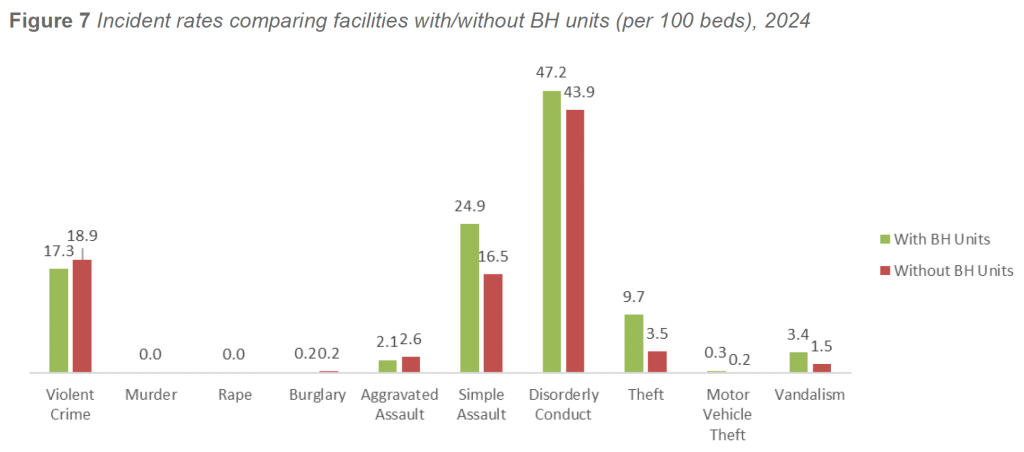 In 2024, facilities with inpatient BH units continued to demonstrate elevated rates of behavior-driven incidents across multiple categories. After excluding zero-bed facilities and adjusting for statistical outliers, violent crime rates averaged 17.3 incidents per 100 beds in facilities with BH units, compared with 18.9 incidents per 100 beds in facilities without BH units. Aggravated assault rates followed a similar pattern, with facilities without BH units reporting higher rates than facilities with BH units (2.6 versus 2.1 incidents per 100 beds, respectively).