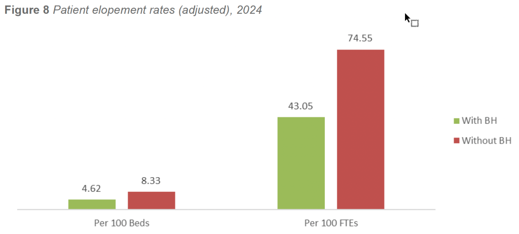 Across multiple survey years, measurement methods, and denominators, the presence of inpatient behavioral health infrastructure functions as a reliable protective factor against patient elopement. Facilities with BH units consistently outperform facilities without such units, despite managing higheracuity patient populations.