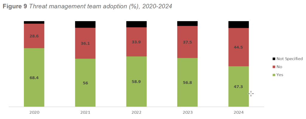 In 2024, 47.3 percent of responding facilities reported having a Threat Management Team in place. This represents a decline from 2023 (56.8 percent) but remains consistent with longer-term adoption patterns observed across prior survey cycles. As in previous years, TMT adoption was most common among facilities with larger campuses, higher behavioral acuity, and more complex operational environments.