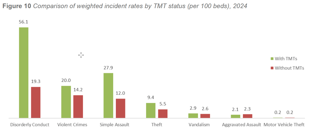 - Simple assault (27.9 per 100 beds, compared with 12.0 per 100 beds in non-TMT facilities)
