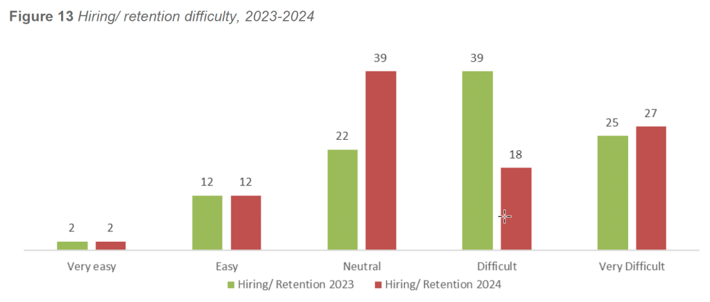 Consistent with 2023 findings, the majority of facilities in 2024 reported hiring conditions in the Neutral, Difficult, or Very Difficult categories. Very few facilities characterized recruitment as Easy or Very Easy.