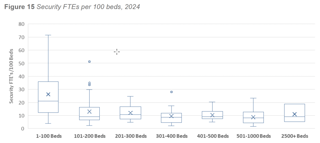 Facilities can use these data to compare their staffing levels against similarly sized and similarly structured organizations, identify gaps relative to behavioral and public interface risk, and support evidence-based justification for staffing enhancements. When integrated with incident data, WPV exposure, and facility-specific vulnerability assessments, staffing metrics provide a powerful tool for aligning security resources with clinical realities and organizational mission.