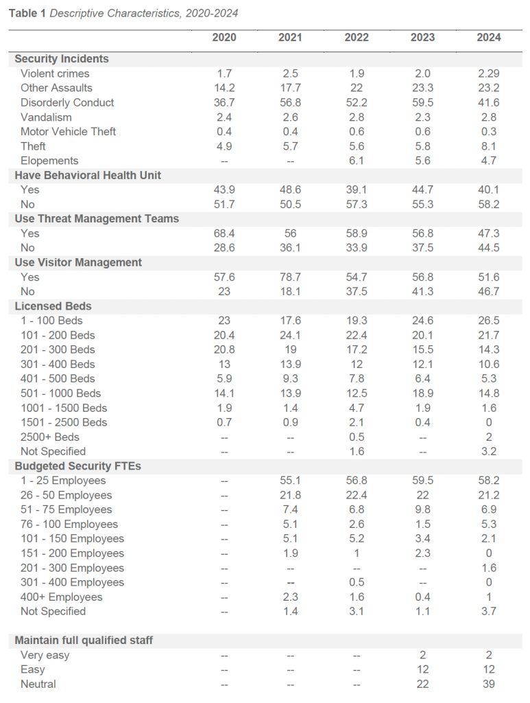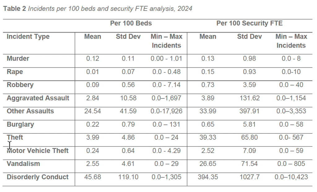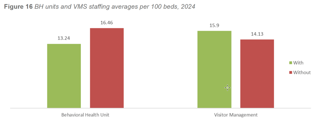 Correlation analysis of the 2024 dataset indicates that facilities with inpatient BH units tend to operate within more complex clinical and operational environments. Facilities with BH units demonstrated a modest positive correlation with security staffing levels (r = 0.29) and licensed bed count (r = 0.23). While these correlations are not strong, they reinforce that facilities operating BH units often require expanded security resources to support higher behavioral acuity, increased incident exposure, and more frequent crisis-driven interactions.