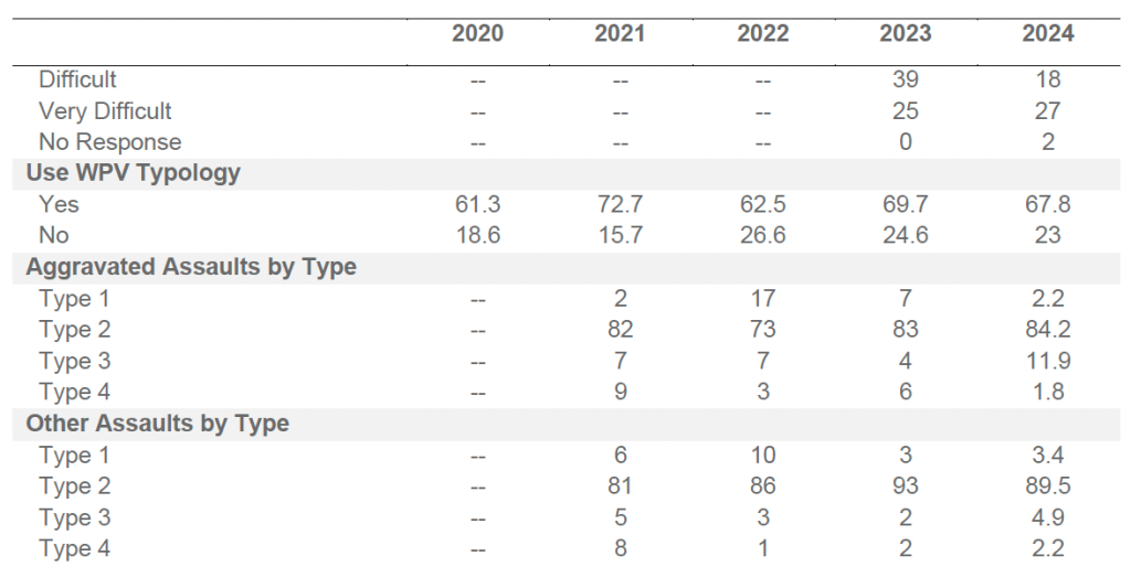 - Partial-year program responses: For questions regarding the presence of behavioral health units, threat management teams, or visitor management programs, respondents sometimes indicated partial-year operation. Consistent with prior years, programs in place for six months or longer were counted as “Yes,” while those in place for less than six months were counted as “No.” Responses that indicated operation in “certain areas” were also treated as “Yes.”
