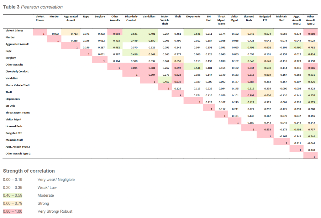 Importantly, the relatively weak correlation with bed size confirms that elevated WPV and behavioral risk in BH-unit facilities is driven more by patient population complexity and service mix than by facility size alone. This finding is consistent with IAHSS guidance emphasizing that security risk in behavioral health environments is not adequately explained by census or square footage metrics in isolation.